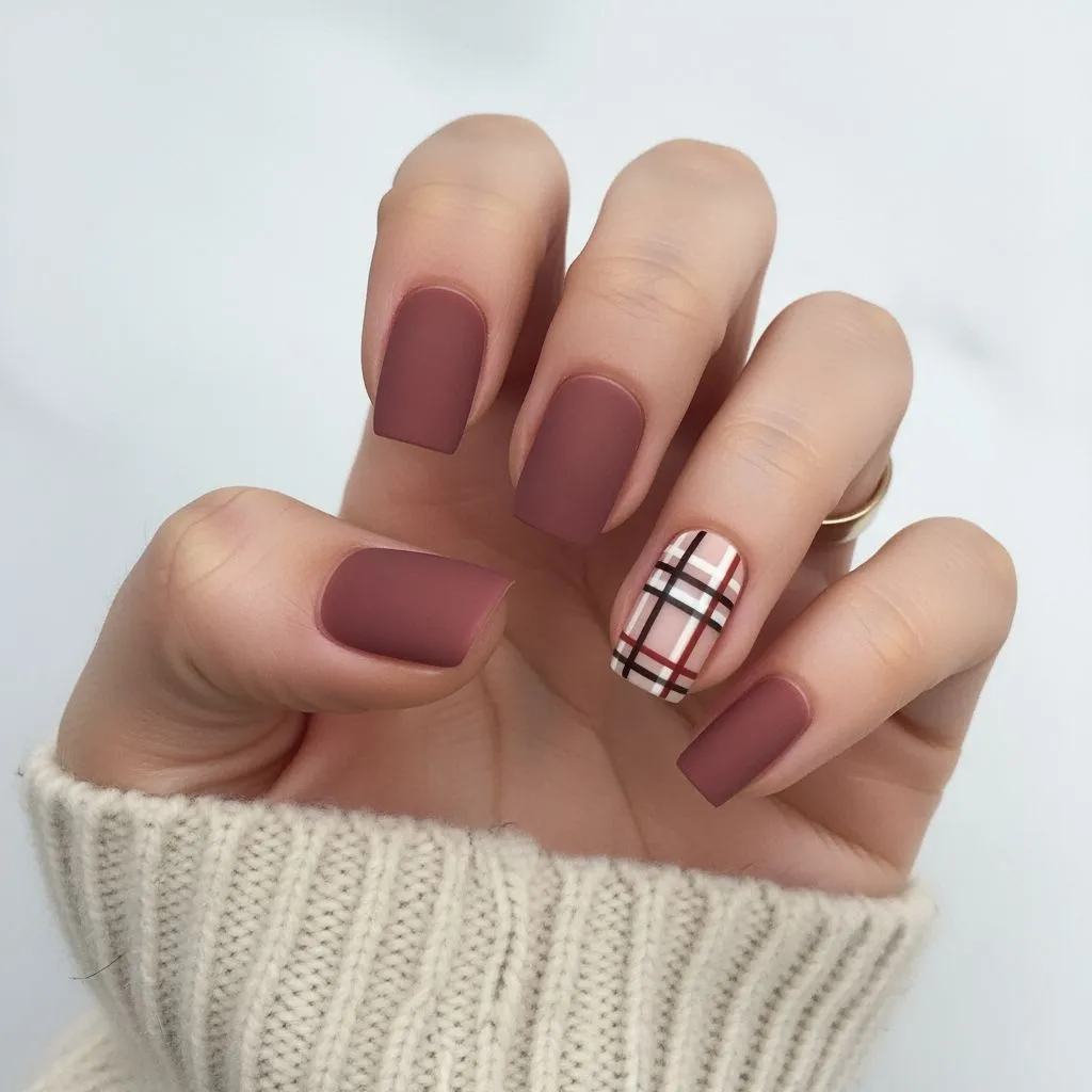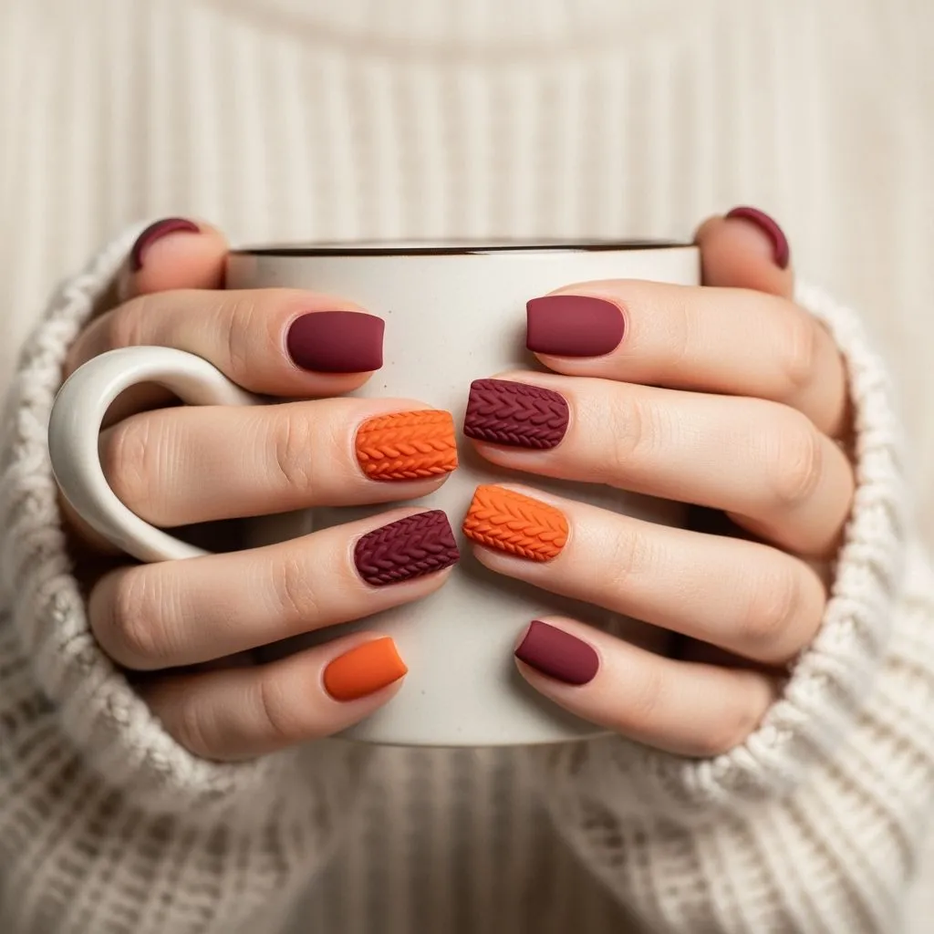 Have you ever seen a manicure that just feels cozy? This is it—your favorite cable sweater in nail form. Imagine a mix of classic fall colors like cranberry red, pumpkin orange, and deep maroon, each on a different nail. What makes it a whole vibe are the accent nails with a raised, 3D knit texture. The matte finish gives it a touchable quality that is so spot on to fall fashion lovers. This is definitely one of the designs that will dominate this season.