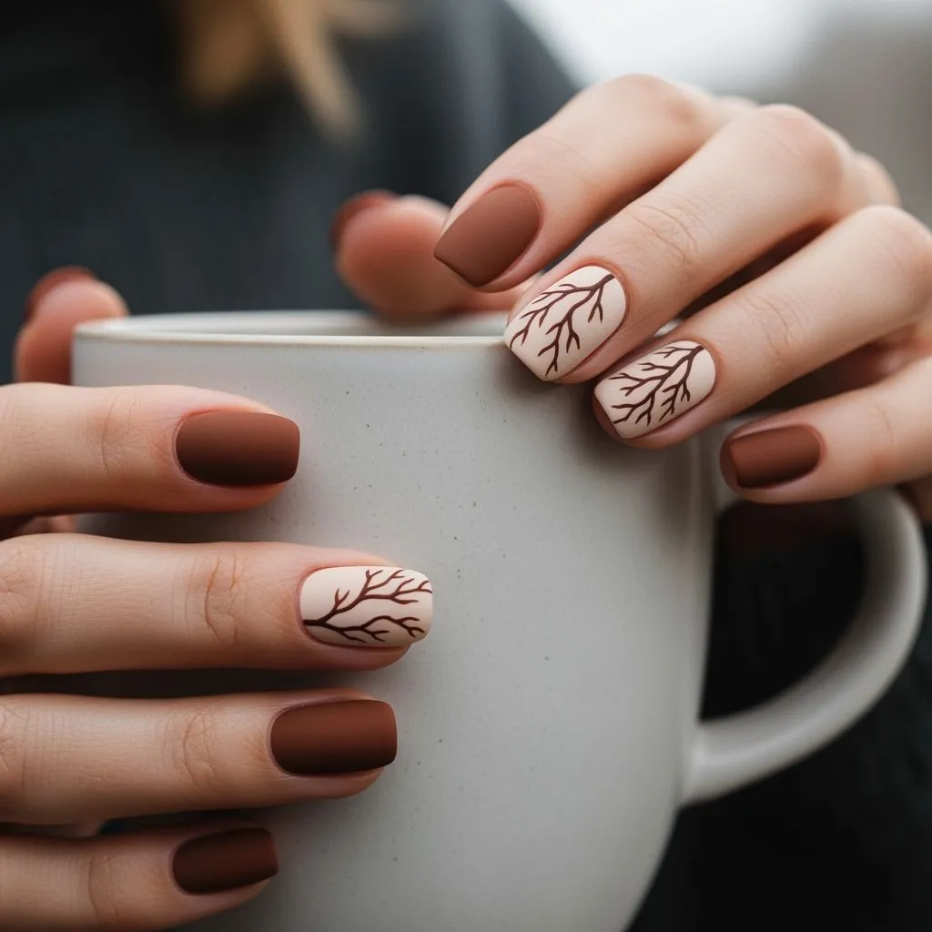 There’s something so comforting about this earthy and elegant design. It’s a beautiful, understated way to nod to the season. The look pairs a creamy cocoa or taupe color on most nails with a pale accent nail. On that accent nail, delicate, leafless branches are drawn in negative space, like a gentle murmur of fall. It’s one of those short nail styles that doesn’t scream for attention but definitely gets noticed when you’re holding your chai latte.