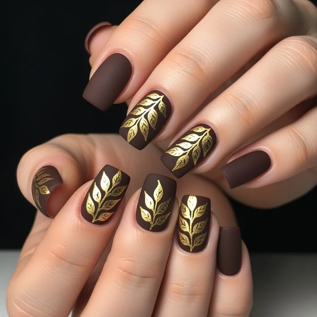 If you’re looking for a manicure that is rich, artistic, and seriously Instagram-worthy, this is it. The matte espresso base is already a showstopper, but then you add those gold foil botanical flourishes and suddenly it looks like luxury fall fashion. The golden leaf designs run over the nails like late-autumn light dancing between the trees. It’s an amazing design for a short, square acrylic set and is sophisticated without being pretentious.