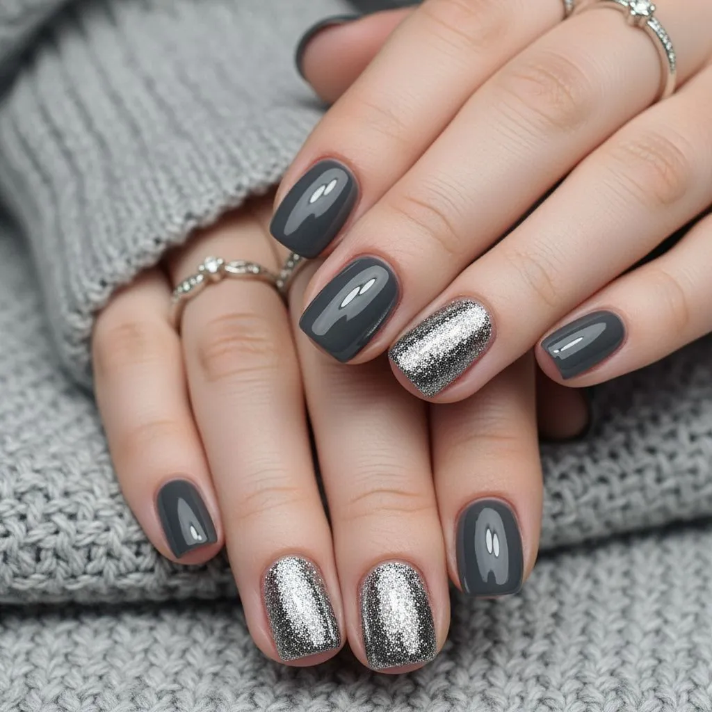 There’s something so romantic about stormy grey nails in the fall. This design nails that cozy-weather glamour with smooth grey nails interrupted by the most perfect ombrĂ© glitter accents. The tonal shift from soft charcoal to deep sparkle is such a cool balance of soft and edgy. I’d file this under short fall nail designs for when you’re craving both chill and sparkle in one set. It’s the type of set that I wear when I’m feeling low—it makes me feel special on a grey Monday.