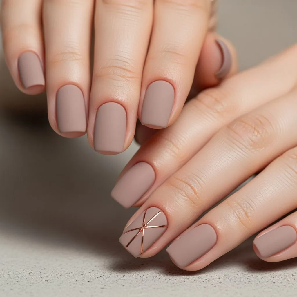 Matte is making a big comeback this fall, and this muted taupe set is proof. It’s calm, neutral, and impossibly elegant. To keep things interesting, a single accent nail features clean, crisscrossed lines and a tiny metallic dot, adding a slight architectural twist. It’s the definition of simple fall nail art and a great idea for short nails when you want something peaceful but still polished. I wore this on a weekend trip and felt so appropriately dressed up!