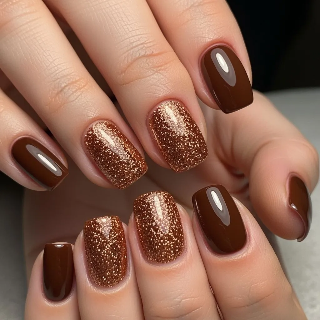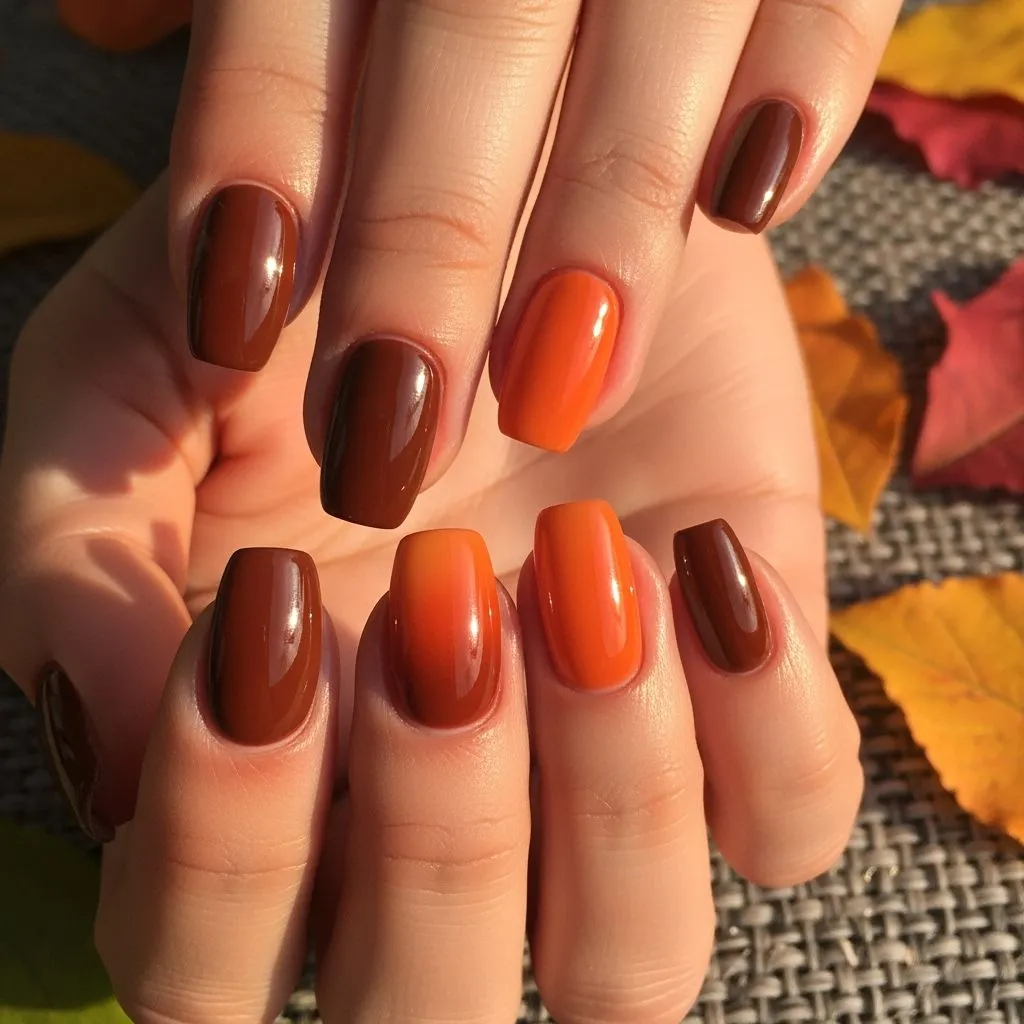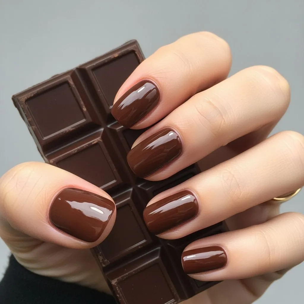 These rich, chocolate brown nails are absolutely perfect for fall! Whether you choose a dark, decadent chocolate or a lighter, creamier brown, this color is a chic and versatile choice for the season. The glossy finish adds a touch of elegance, and the almond shape is super flattering. A simple, solid brown manicure is timeless, sophisticated, and always looks put-together.