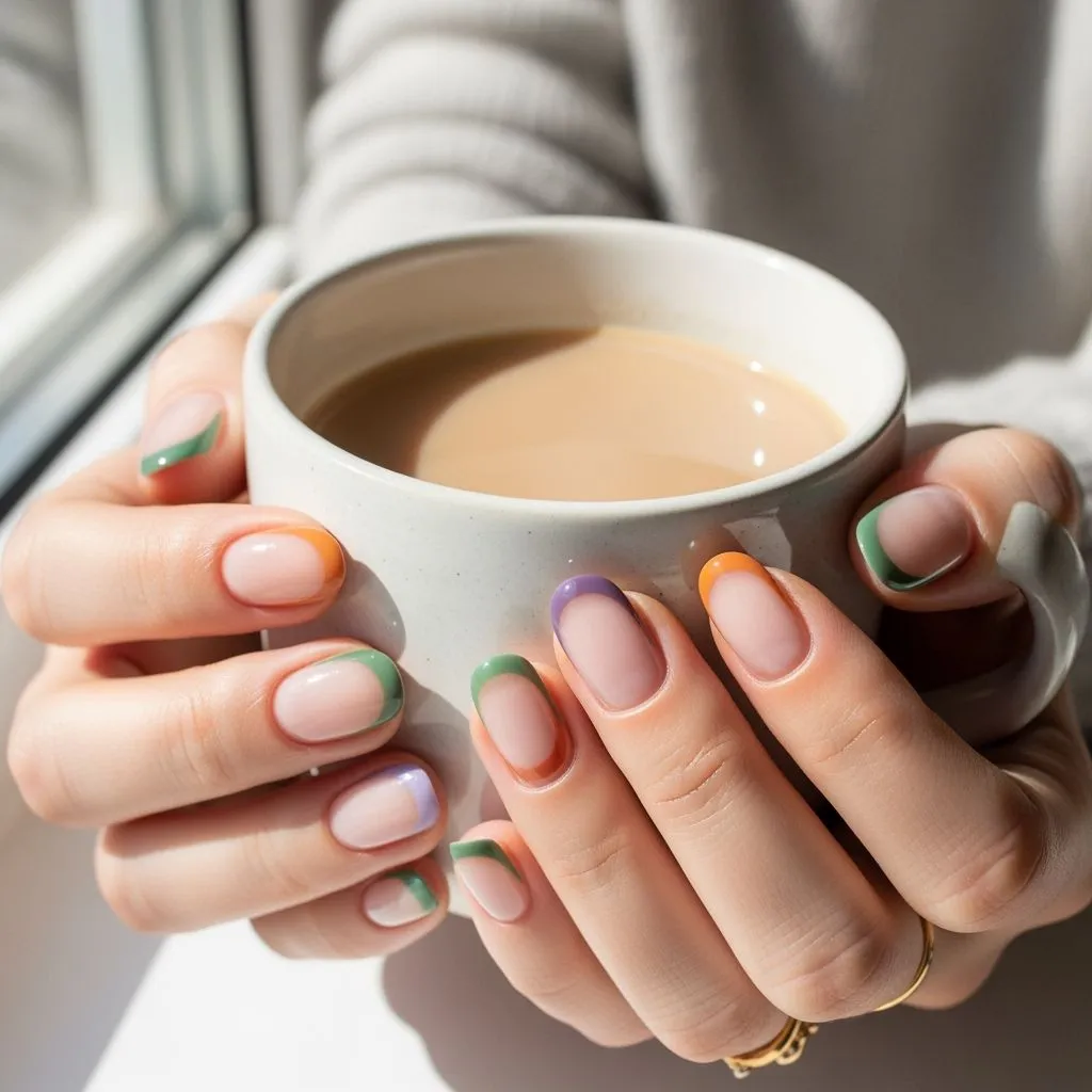 This look is a total breath of fresh air and a gentle, surprising way to do fall nails. We’re giving the classic French a fresh, 2025 update by swapping out the basic white for a dreamy combination of sage green, plum, dusty lilac, and a hint of tangerine. This look feels both relaxed and lighthearted at the same time. I personally love how it’s a killer transition design for November—cozy, but still playful. It’s the kind of manicure that doesn’t scream trend, it whispers it.
