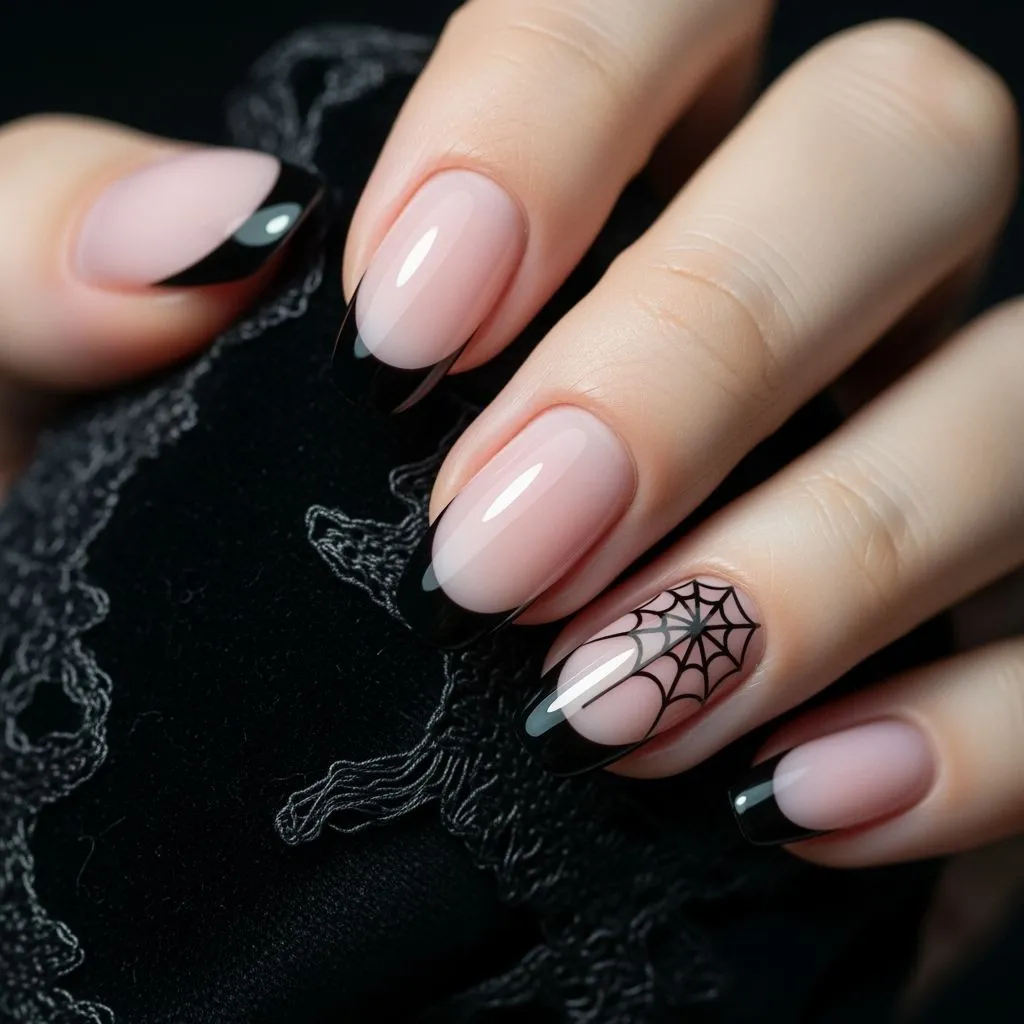 Ready to get into the spooky season while keeping it totally chic? This manicure is for you. It gives off all the spooky vibes with its stylish black French tips and an adorable spider web accent nail. The contrast between a soft pink base and the bold black tips is perfect for the season. It’s the ideal way to feel festive and fun without sacrificing any elegance. I think this look is the perfect blend of spooky and chic!