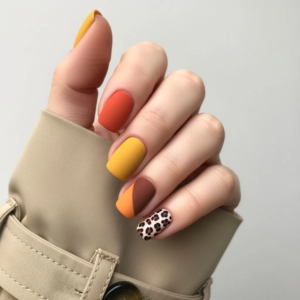 This manicure instantly transports me to a crisp November morning with an oversized sweater and a coffee in hand. It’s a bold and playful mix of matte mustard, terracotta, and deep cocoa, but the real star is the cheeky leopard accent nail. The matte finish is what makes this feel so chic—it tones down the wild print so it feels classy, not excessive. It’s a design that has both autumn vibes and that baddie confidence.