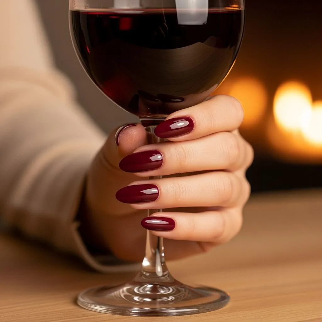Can we just agree that nothing is better for fall than short nails in a stunning burgundy? This wine-red is classic, sexy, and simply perfect for when the temperature starts to drop. The shape is a soft almond, and the gloss brings major “just sipped Merlot” vibes. It’s the kind of manicure you wear when you have a dinner date and no time to change—it becomes the accessory. It’s a classic for a reason, but it still feels totally on-trend for 2025.