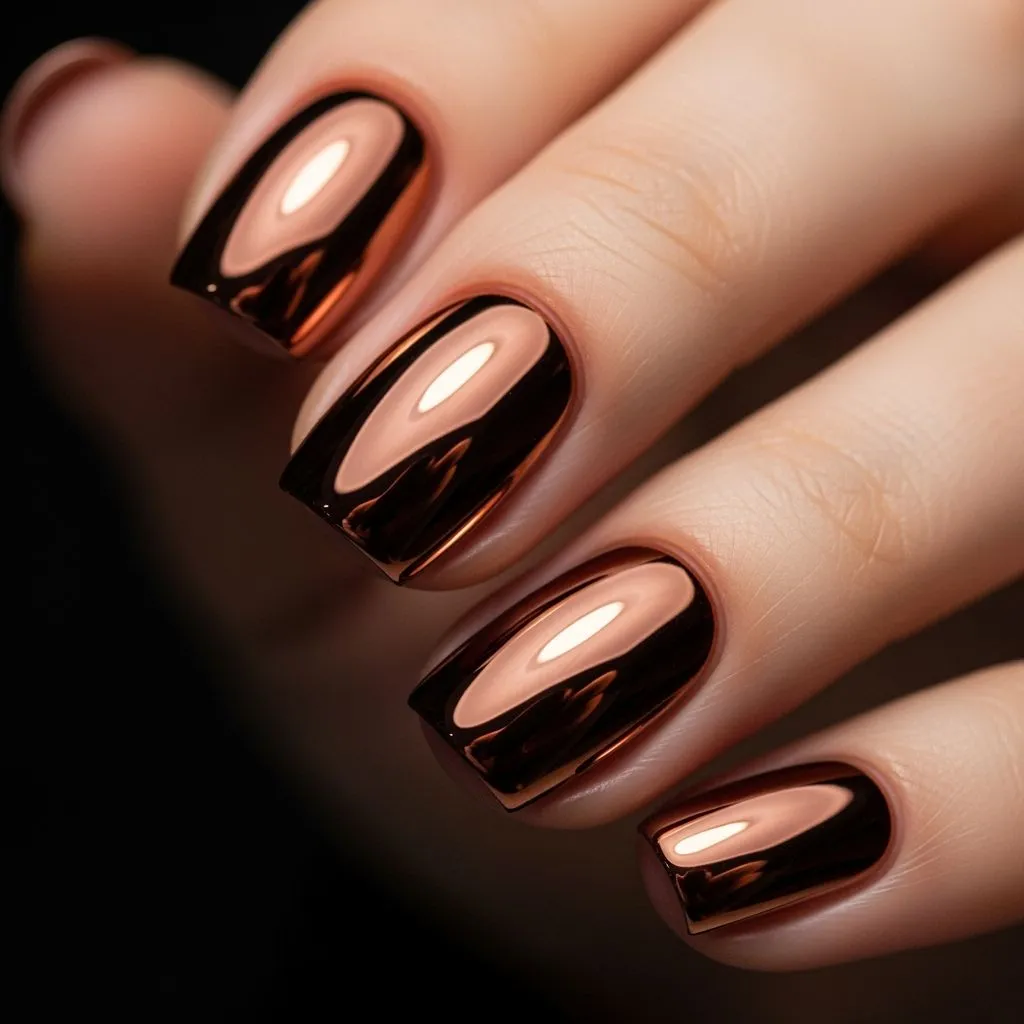 Get ready to shine this season! Metallic copper or brown chrome nails are one of fall’s most eye-catching trends. The warm hue and glossy, mirror-like finish complement any fall outfit beautifully. This look is all about making a simple yet powerful statement. The way the metallic finish catches the light is just mesmerizing, adding an instant touch of glam and sophistication to your look. If you want a manicure that’s trendy and chic, this is the one!