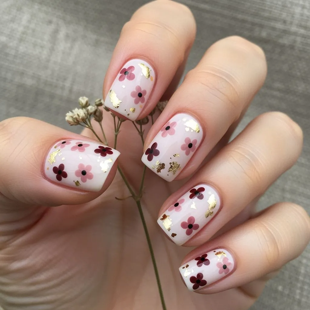 This design is for the minimalists who still want that little something extra. It’s a short and sweet look that feels both cozy and airy at the same time. On a creamy, milky blush foundation, tiny flowers and delicate gold leaf details are scattered like fallen petals. The little flecks of gold foil are what make it special, glittering when they catch the light. It’s a simple look that’s forgiving, fashionable, and makes you feel put-together.