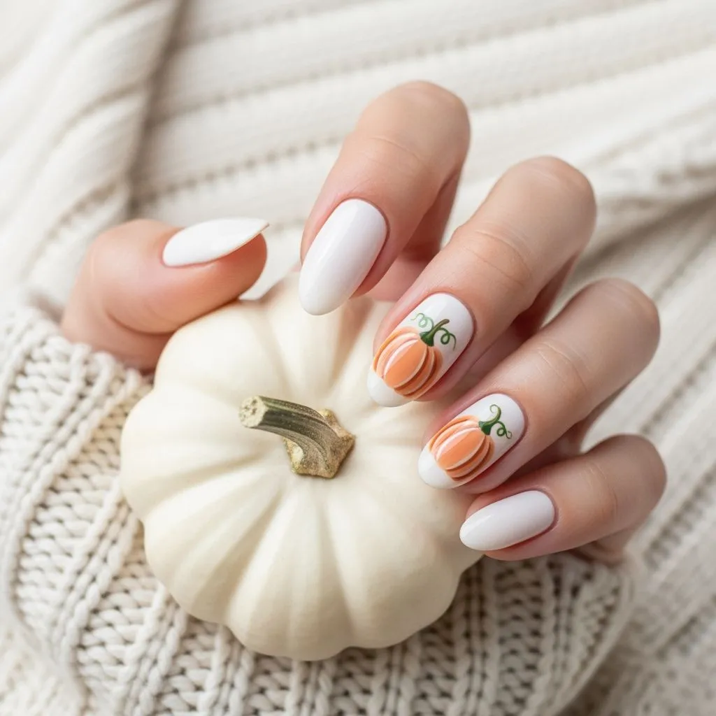 You can’t have fall without pumpkins! This is the perfect manicure for getting into the festive spirit. For a look that’s totally Instagrammable, add small, cute pumpkin art to one or two accent nails. You can even mix it up with other playful elements like ghosts and flowers for a look where each nail tells its own little story. Using soft orange and green tones keeps the design fun and chic.
