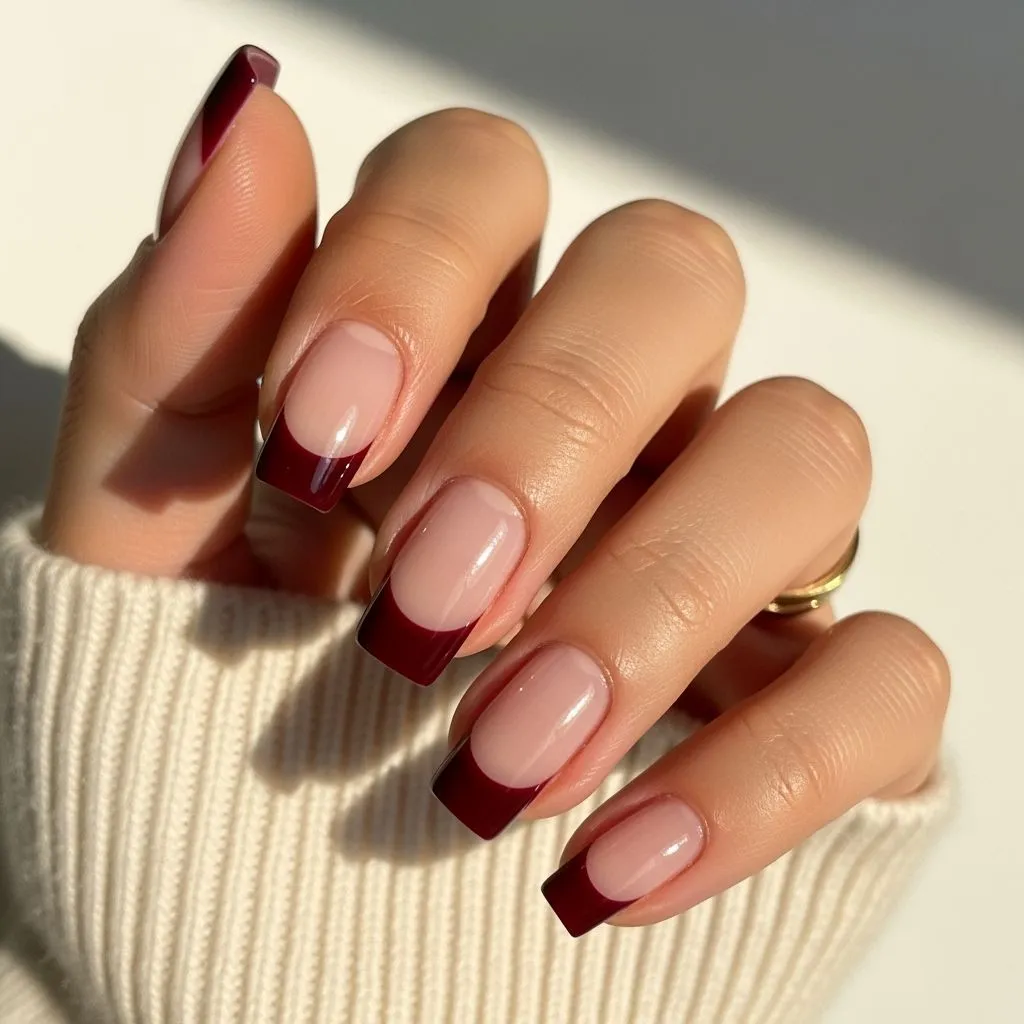 This manicure is absolutely stunning and effortlessly elegant. It takes the timeless French tip and gives it a chic fall update with deep burgundy tips that perfectly contrast a nude base. The sleek and sophisticated design feels perfect for any autumn outfit, from cozy sweaters to evening wear. For a little extra glam, you can even add delicate gold star accents for a look that feels both festive and chic. new go-to autumn manicure! #BurgundyNails #FrenchManicure #FallNails #ClassicNails