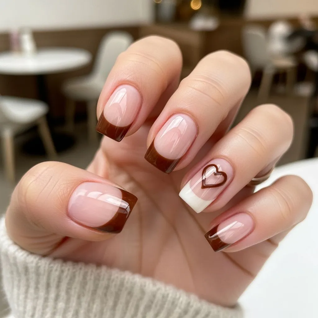 This manicure is just so sweet and sophisticated! It’s an adorable twist on the classic French, featuring sleek, chocolate brown tips that are perfect for fall. What makes this look so special is the cute little heart accent on the ring finger, which adds a touch of playful charm. The glossy finish gives it a polished elegance, making it a simple way to elevate your everyday style this autumn.