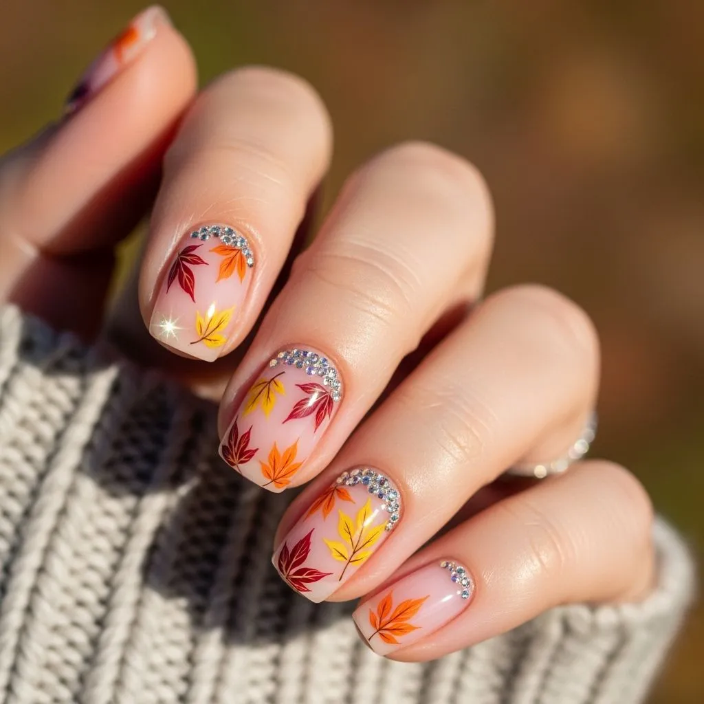 This manicure is pure magic for your fingertips. It has all the classy autumn energy you could want, making it ideal for when you’re dreaming of chunky sweaters and hot apple cider. Picture delicate autumn leaves in shades of orange, yellow, and burgundy over a soft pink background. The show-stopping detail is the little sprinkling of rhinestones that twinkle across the cuticle. It’s a definite hit for short fall nails and feels feminine but strong, soft but confident.